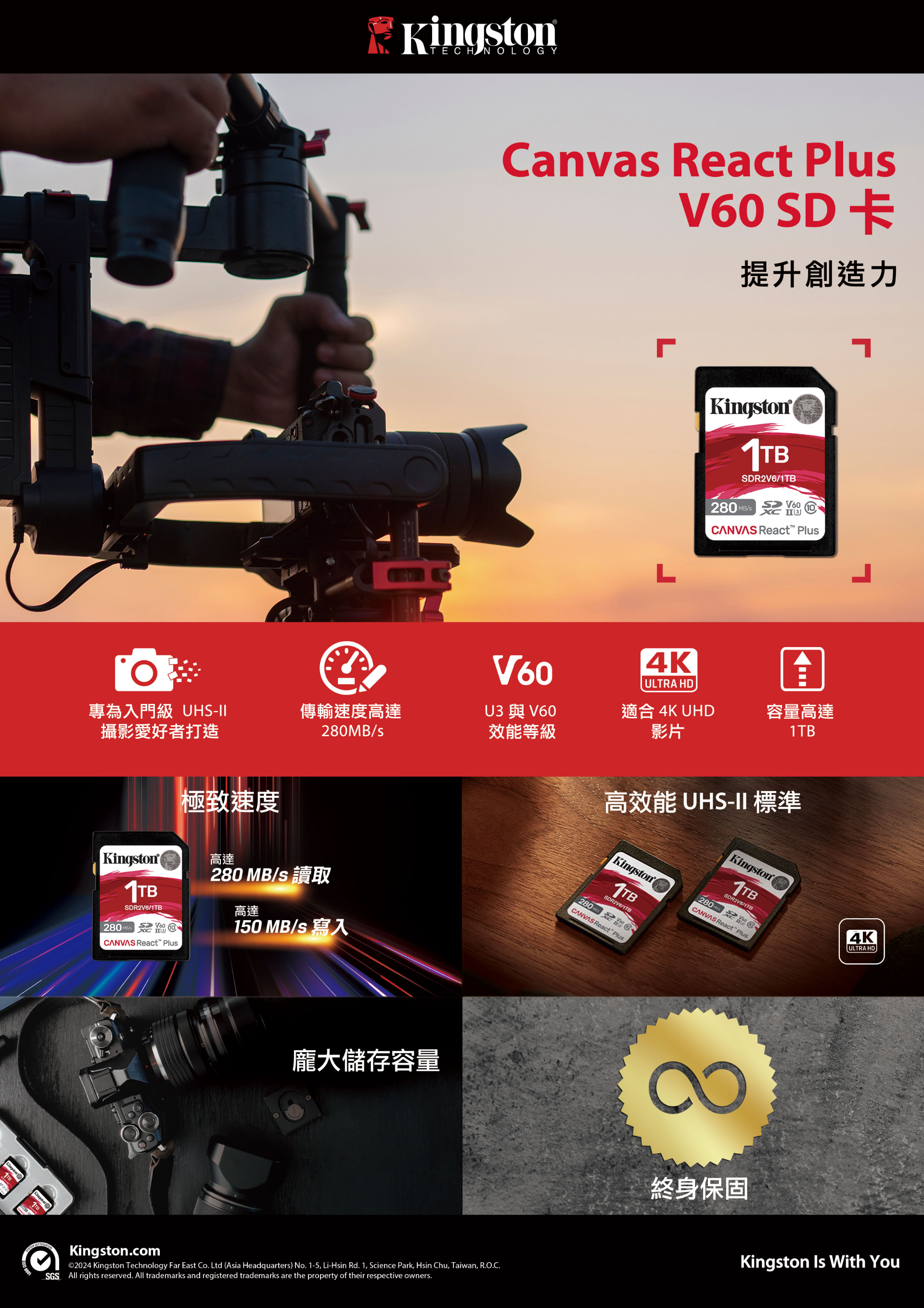 Kingston Canvas React Plus SD 記憶卡專為入門級 UHS-II 攝影愛好人士所量身打造,提供令人印象深刻的效能,與創作新秀所使用的 UHS-II 標準相機相得益彰,能以比 UHS-I 更高的每秒影格數 (fps) 捕捉 4K 影片。本記憶卡擁有 U3 和 V60 速度等級,傳輸速度高達 280MB/s,儲存容量高達 1TB。告別緩慢的速度和影格遺失問題,確保無縫的創作過程,進而強化工作流程和效率。