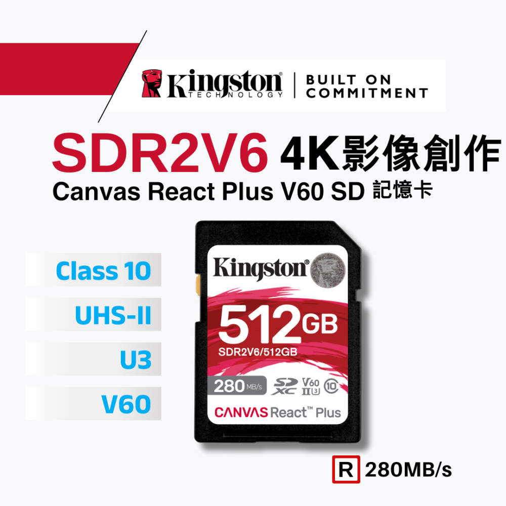 金士頓 Canvas React Plus 512GB SD 記憶卡 UHS-II 4K U3 V60 SDR2V6