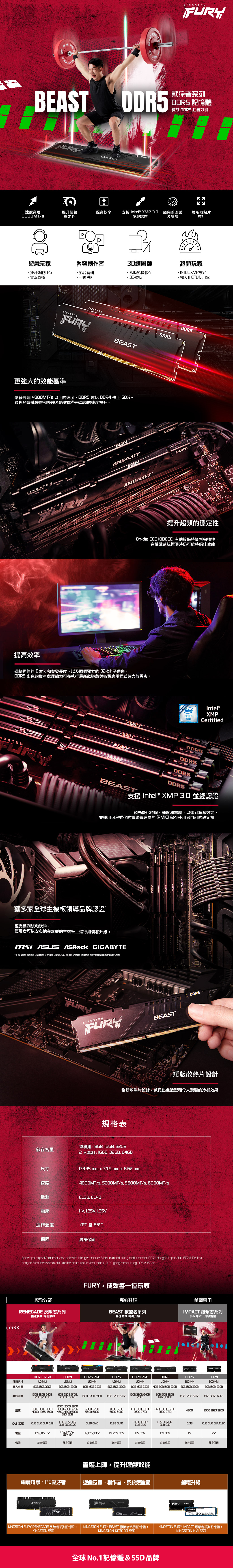 無論是希望突破遊戲效能極限、進行 4K 以上的直播串流,或者處理複雜的動畫和 3D 渲染效果,Kingston FURY Beast DDR5 都可藉由記憶體升級打造無縫的流暢體驗、成就絕佳效能。