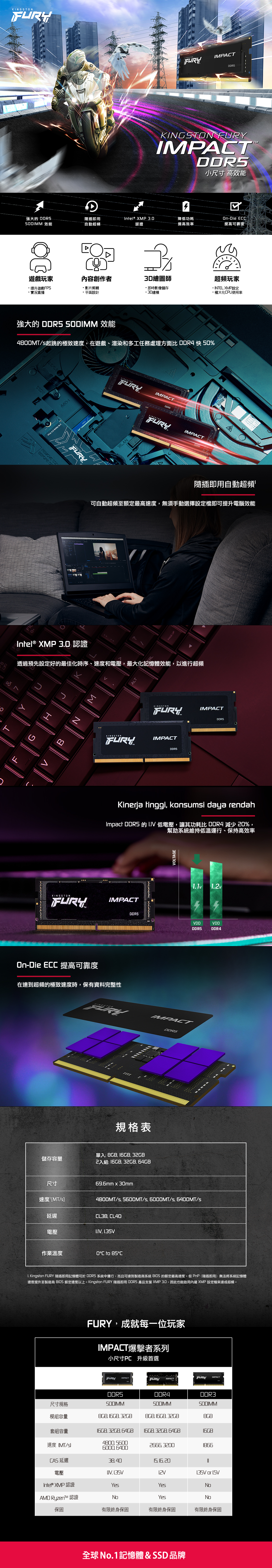 金士頓 FURY Impact DDR5 5600 32GB(16GBx2) 筆記型 KF556S40IBK2-32
