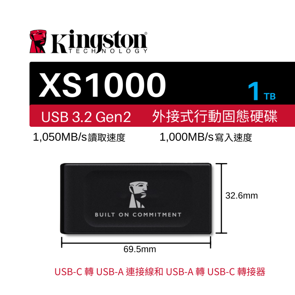 金士頓 XS1000系列 1TB TypeC to TypeA 外接式固態硬碟 黑色 SXS1000 時尚輕巧