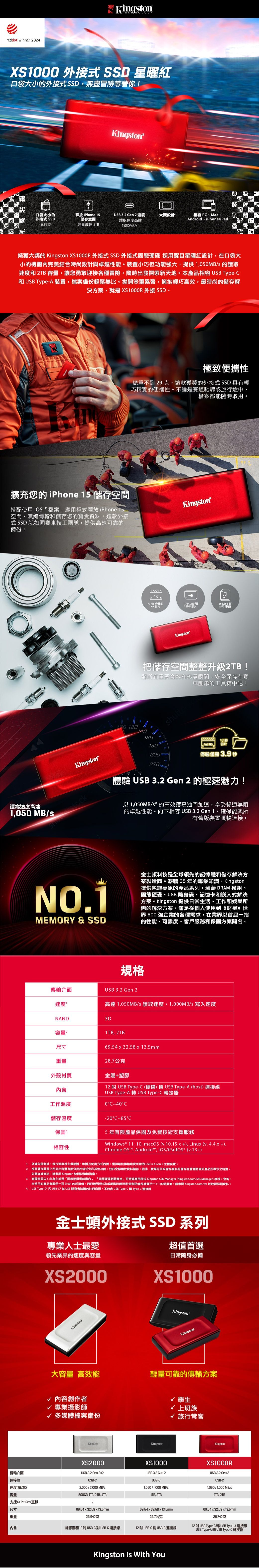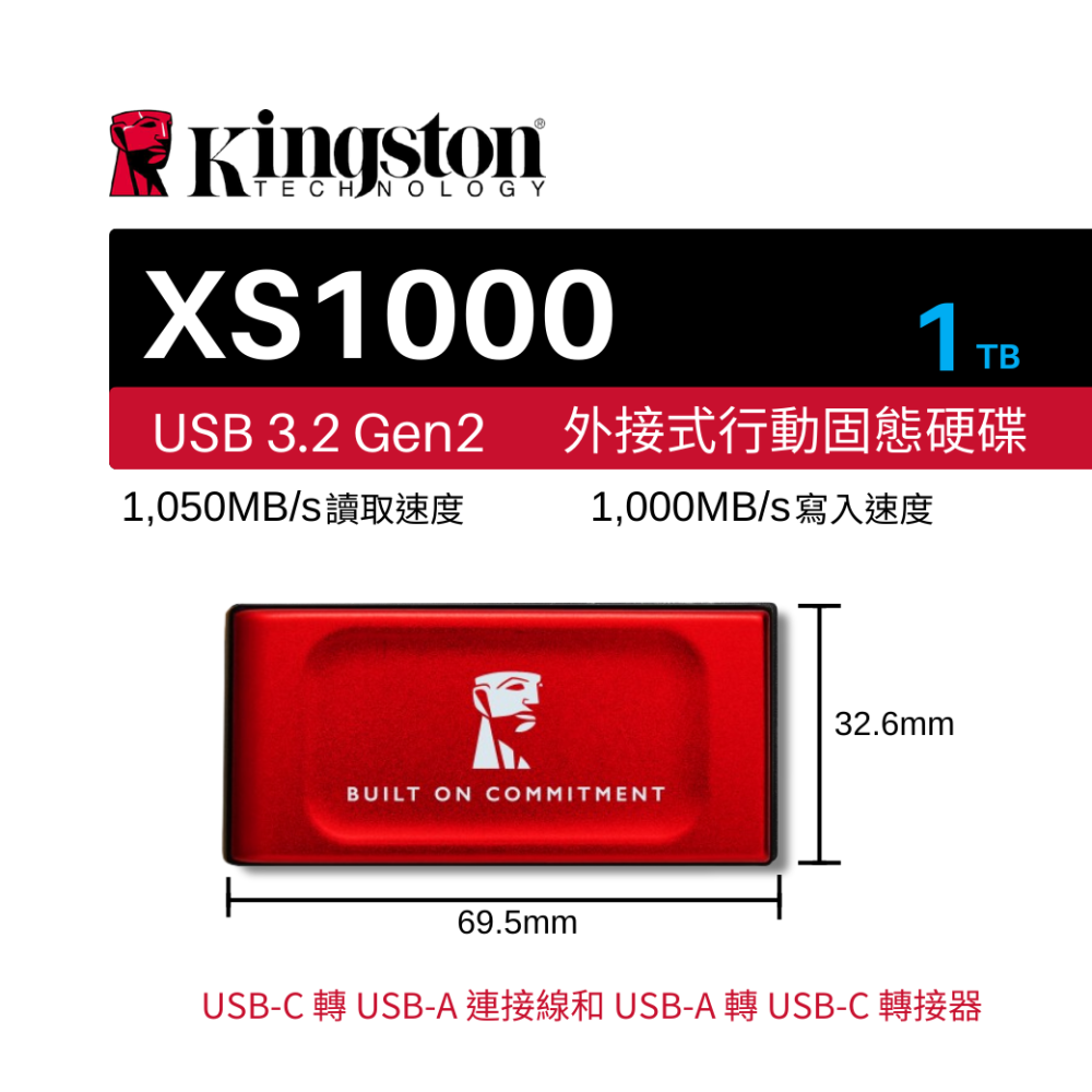 金士頓 XS1000系列 1TB TypeC to TypeA 外接式固態硬碟 紅色 SXS1000R 時尚輕巧
