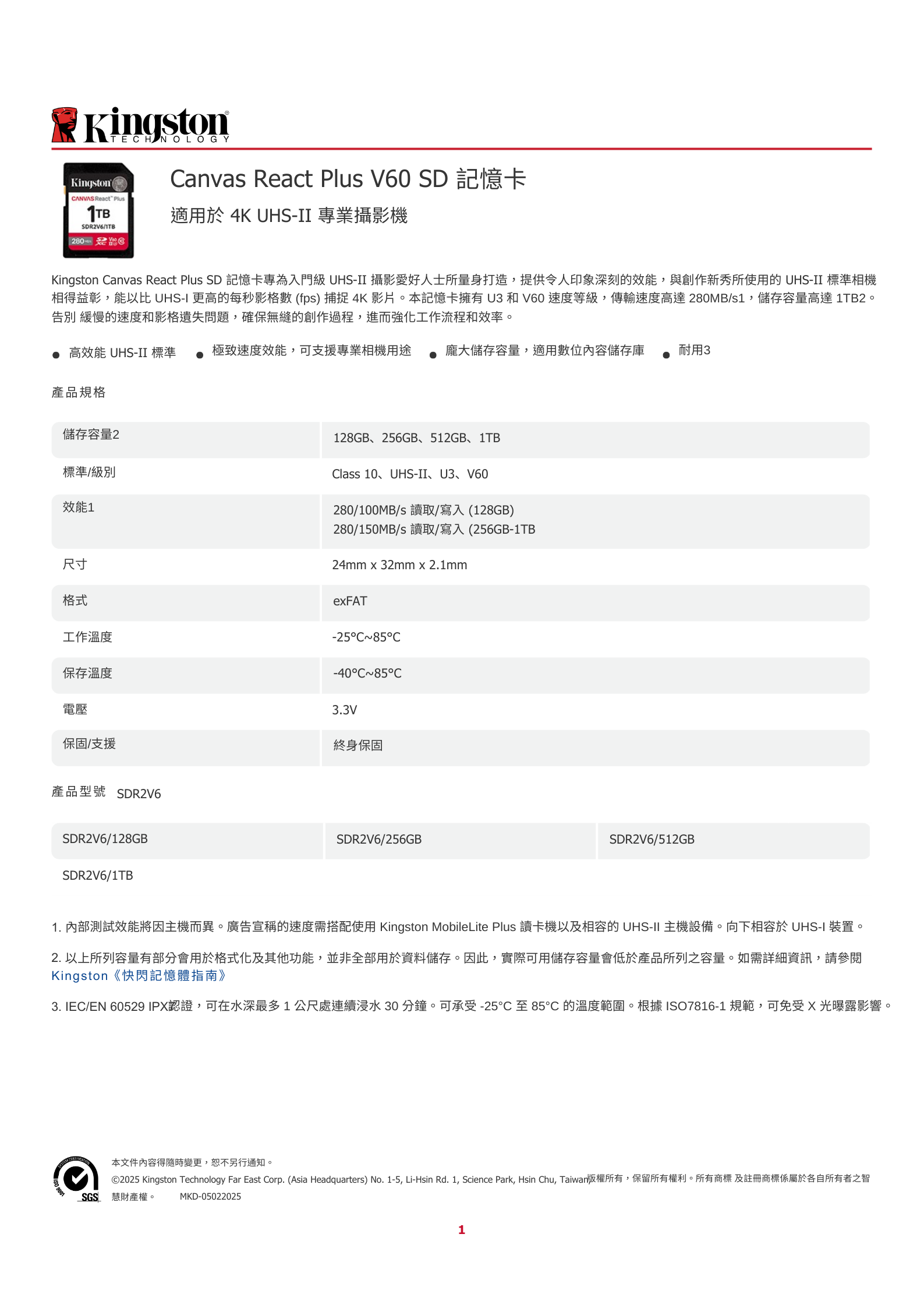 金士頓 Canvas React Plus 256GB SD 記憶卡 UHS-II 4K U3 V60 SDR2V6