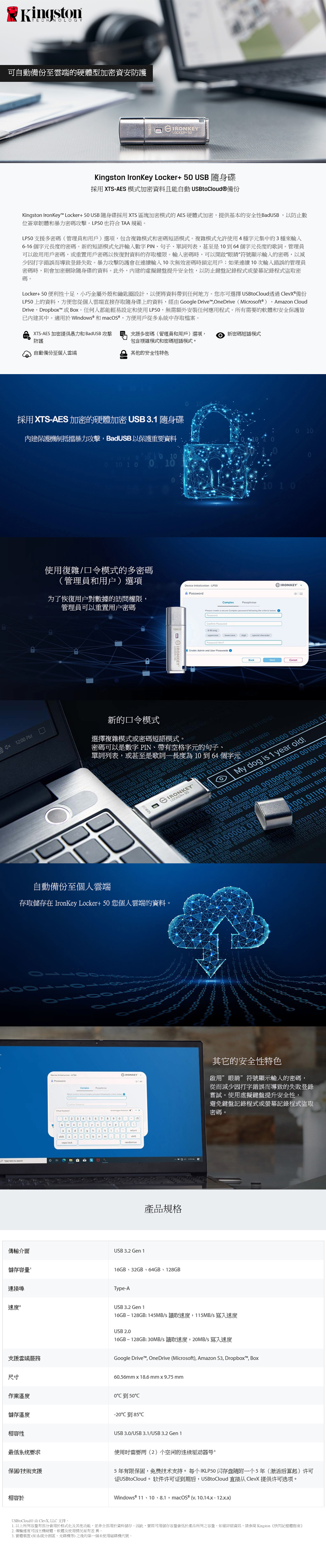 金士頓 Kingston IronKey Locker+ 50 硬體加密 128GB USB 隨身碟 IKLP50