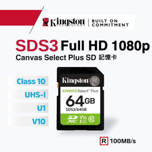 金士頓 Canvas Select Plus 64GB Class 10 UHS-I SD 記憶卡 SDS3