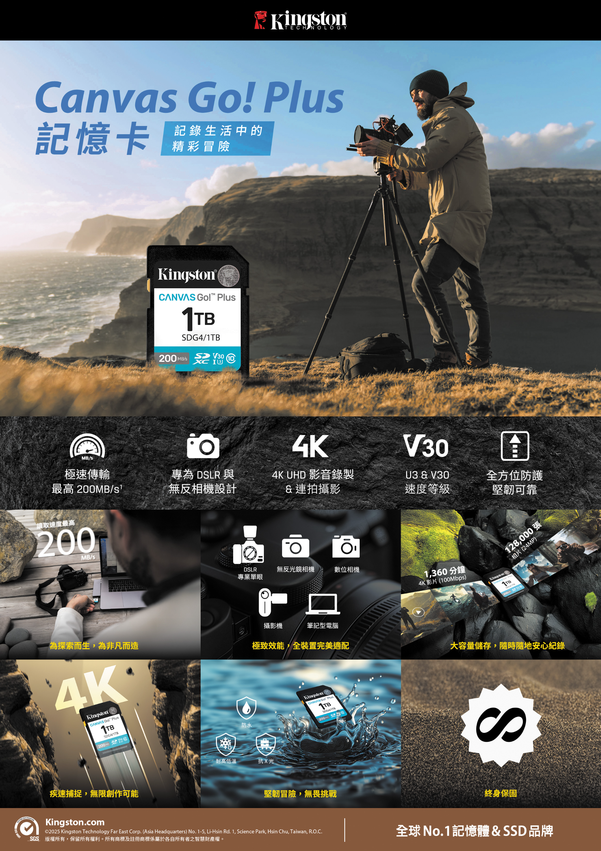 金士頓 Canvas Go!Plus 128GB SD 記憶卡 V30 U3 4K影片錄製 SDG4