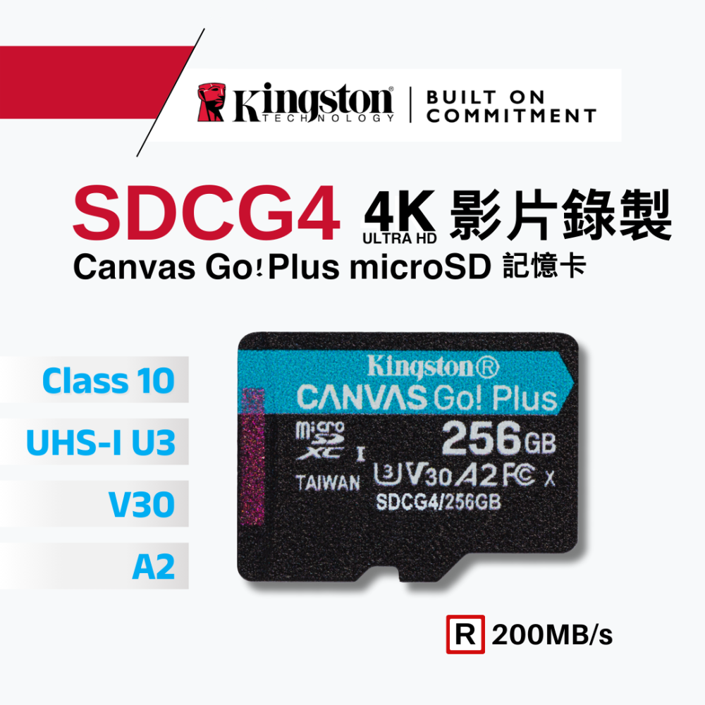 金士頓 Canvas Go!Plus 256GB microSD 記憶卡 UHS-I U3 V30 4K SDCG4