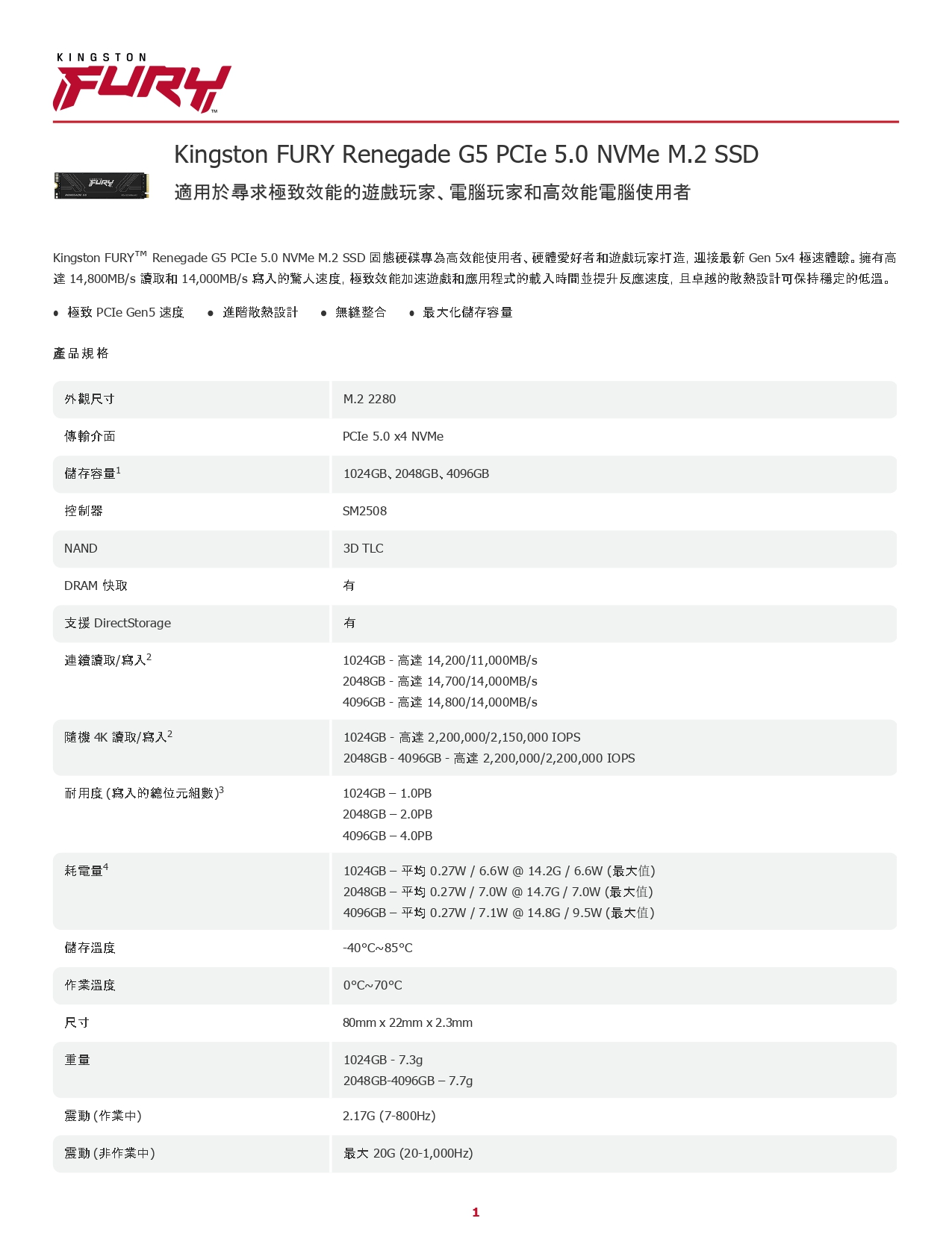 金士頓 Kingston FURY Renegade G5 1TB PCIe5.0 M.2 2280 單面 SSD