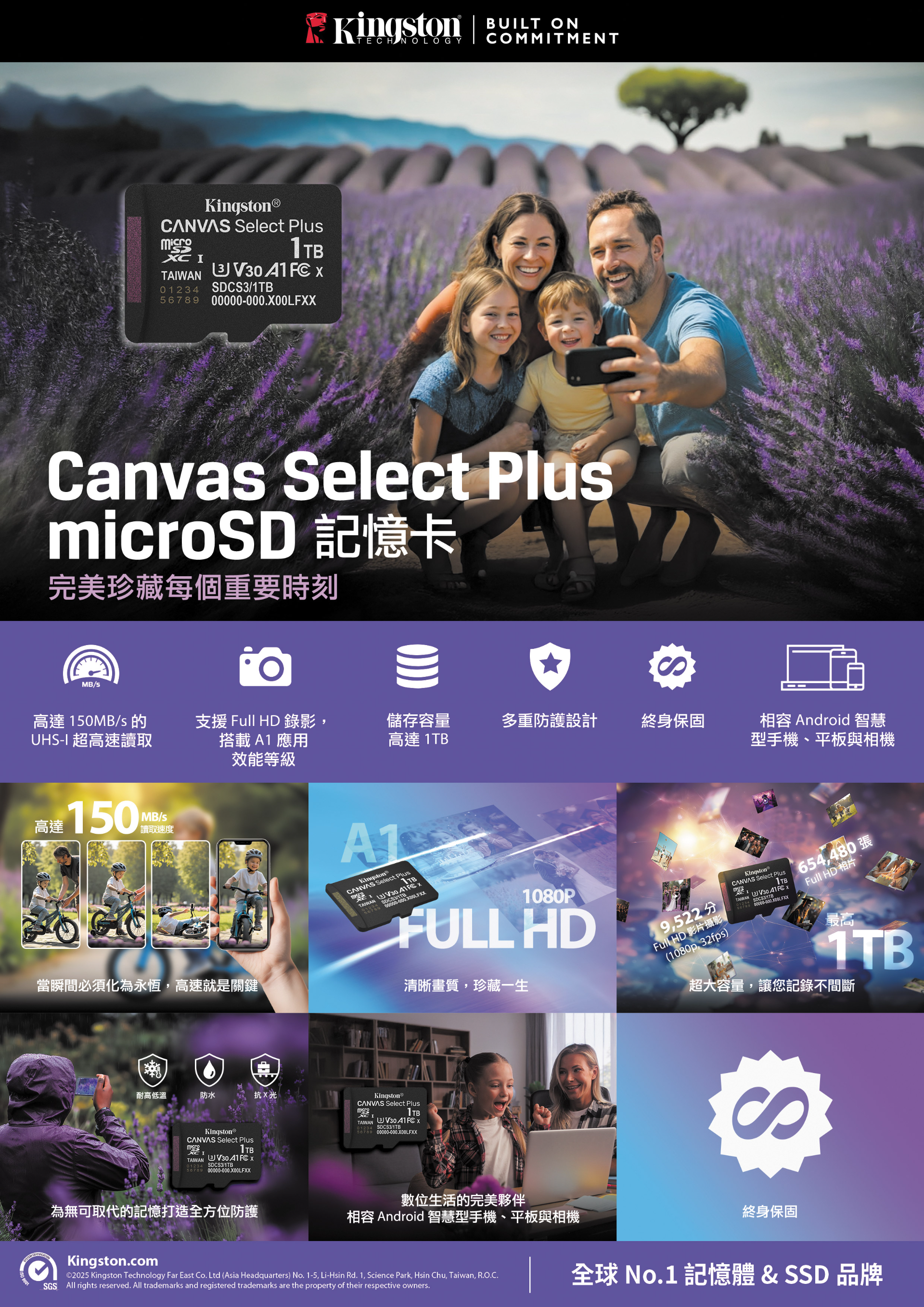 Kingston 的 Canvas Select Plus microSD 記憶卡相容於 Android 裝置,並具備強化的 A1 等級效能。此記憶卡具備可靠的速度與最高達 1TB2的儲存容量,可加快應用程式載入速度並支援照片與影片拍攝。Canvas Select Plus microSD 具備強大的效能、速度與耐用性,專為可靠性而設計,讓您外出攜帶也能安心保護照片、影片與檔案。提供產品終身保固。