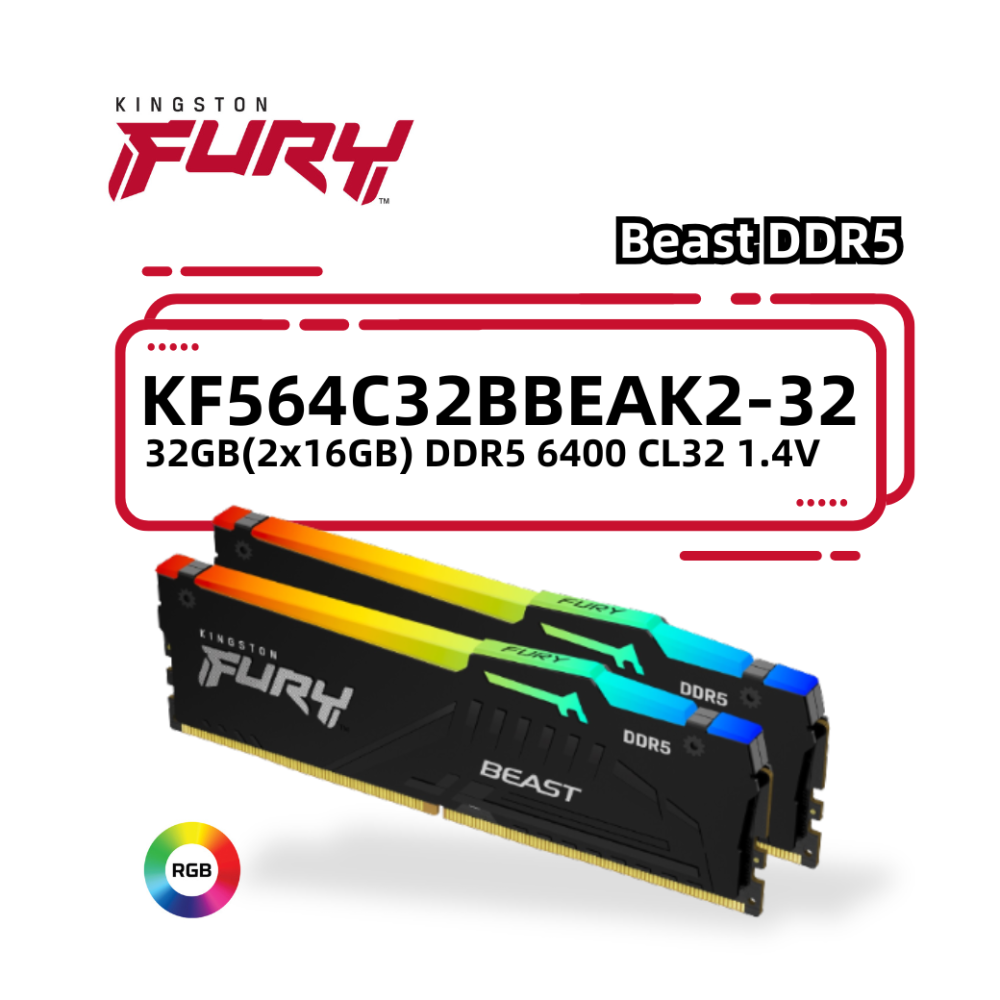金士頓 FURY Beast 32GB(16GBx2) DDR5 6400 RGB CL32 桌上型 電競記憶體