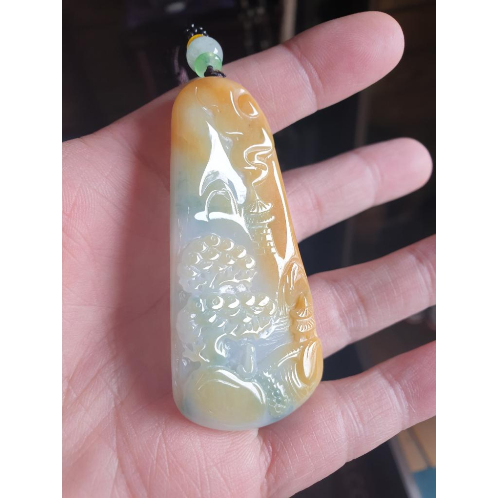 逸品軒~天然緬甸玉A貨-R1879-細糯黃翡帶飄花山水貴人墜子 長70.3mm寬34.3mm厚7.2mm 玉質細膩、水頭