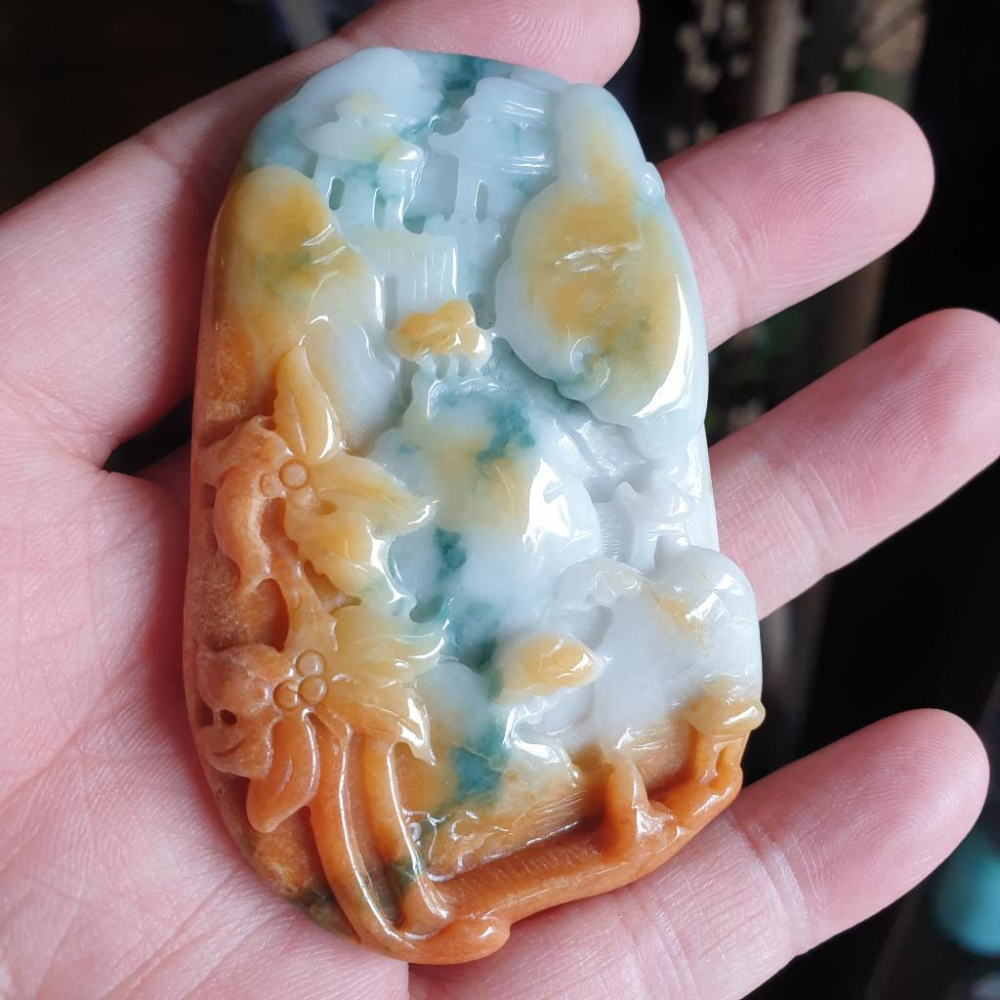 逸品軒~天然緬甸玉A貨-R1903-黃翡飄花山水貴人墜子 長74mm寬47.2mm厚10.2mm 顏色漂亮,黃翡處較乾。