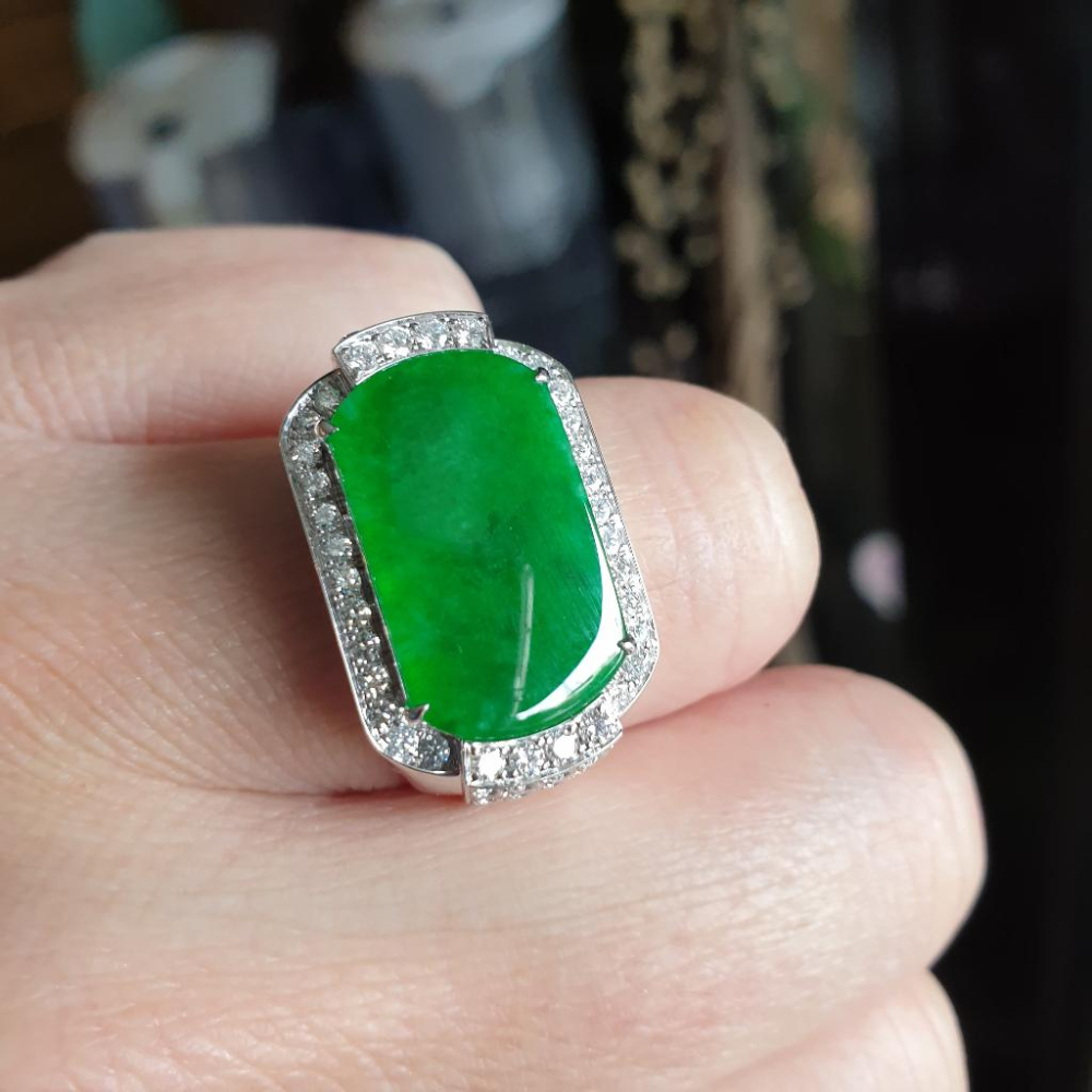 天然緬甸玉A貨-Y632-綠馬鞍戒指 長25mm 寬15.8mm 內徑18.8mm 約國際圍#16 18K金真鑽,顏色漂