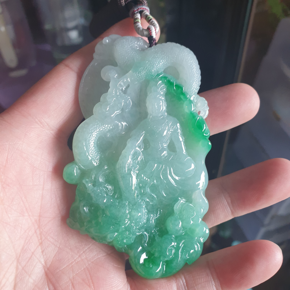 逸品軒~天然緬甸玉A貨-R0001-冰細糯陽綠乘龍觀音墜子(附亞瑟證書)