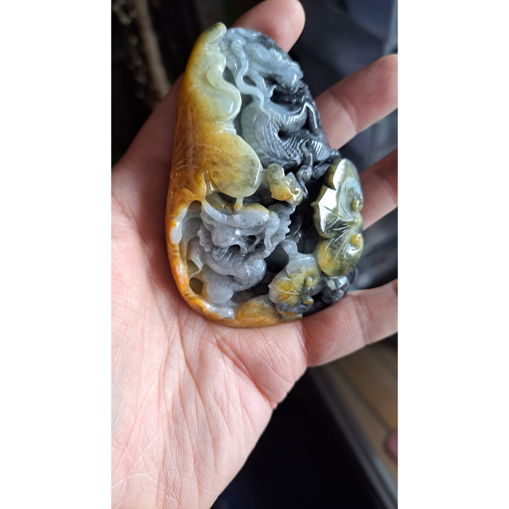 逸品軒~天然緬甸玉A貨-R2174-黃翡帶烏雞雙龍如意墜子/手把件