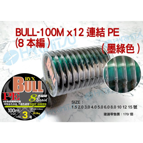 【魚戰釣具】HARIMITSU BULL-100m(墨綠色) 8股pe線 連結線 不退色