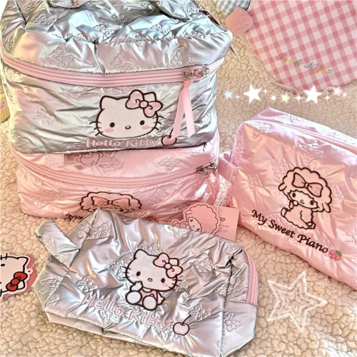 正品 三麗鷗KITTY羽絨布刺繡化妝箱 旅行便攜絲帶甜美手拿包