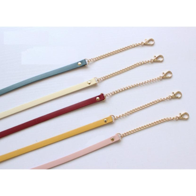 1.寬度:0.9 2.長度:120公分 3.材質:二層牛皮 4.背帶顏色:芥茉黃,髒粉,棗紅,霧霾藍,乳白 5.鏈條顏色:金色,古銅色