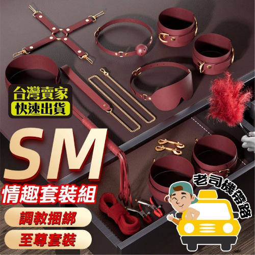 7件組含:眼罩*1、口塞球*1、手銬*2、腳銬*2、皮鞭*1、乳夾*2、束縛繩*1