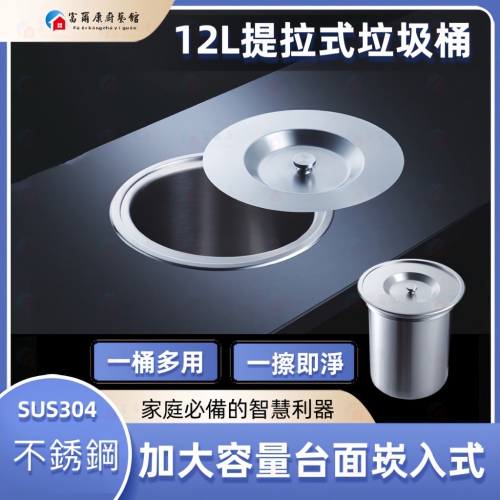 【富爾康】12L加大容量304不銹鋼廚房檯面崁入式垃圾桶桌面隱藏水槽清潔桶內嵌廚餘桶防臭垃圾桶收納桶清潔桶崁入