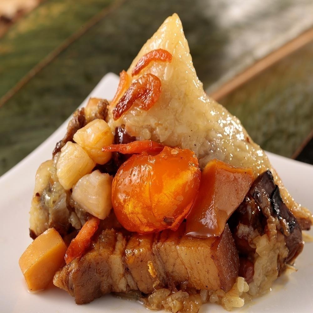 🅾成分 : 糯米、干貝、花枝、香菇、鹹鴨蛋黃、 金鉤蝦、滷豬肉塊、扁魚酥、紅蔥頭、 花生、糖、鹽、醬油