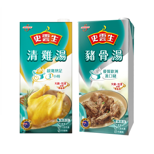史雲生清雞湯更一直深入民心,是大家的入廚好拍檔。清雞湯以優質上雞熬製,滴滴都是真正鮮雞精華,味道鮮甜可口,適合烹調各種菜式或做湯底。除清雞湯外,史雲生更備有豬骨、鮮魚、瑤柱、金華火腿4款上湯口味,而各款口味均選用優質材料熬製而成,不添加任何防腐劑*,並經低脂處理,不含脂肪。無論做火鍋湯底、湯麵、各款家常小菜以至鮑參翅肚,加入史雲生上湯,頓變成滋味無窮的佳餚。