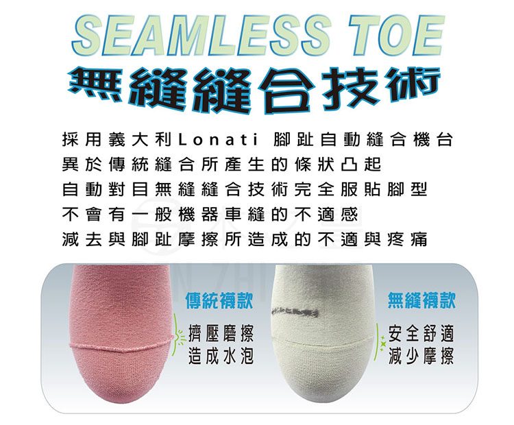 ● 腳趾無縫縫合:使用義大利Lonati腳趾自動縫合機台,自動對目,無縫平整縫合,無條狀凸起,避免與腳趾摩擦造成不適與疼痛。