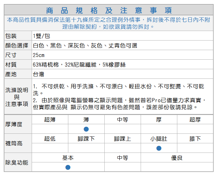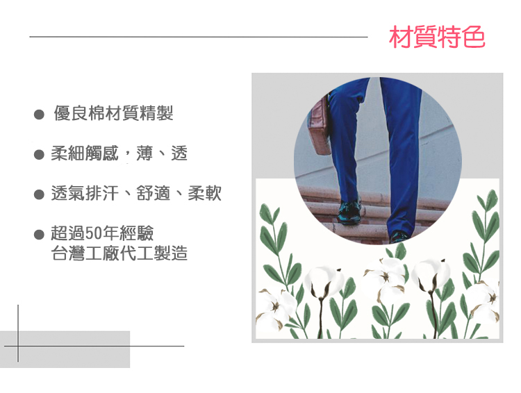 ● 柔細觸感,薄、透,透氣排汗,耐磨、舒適。
