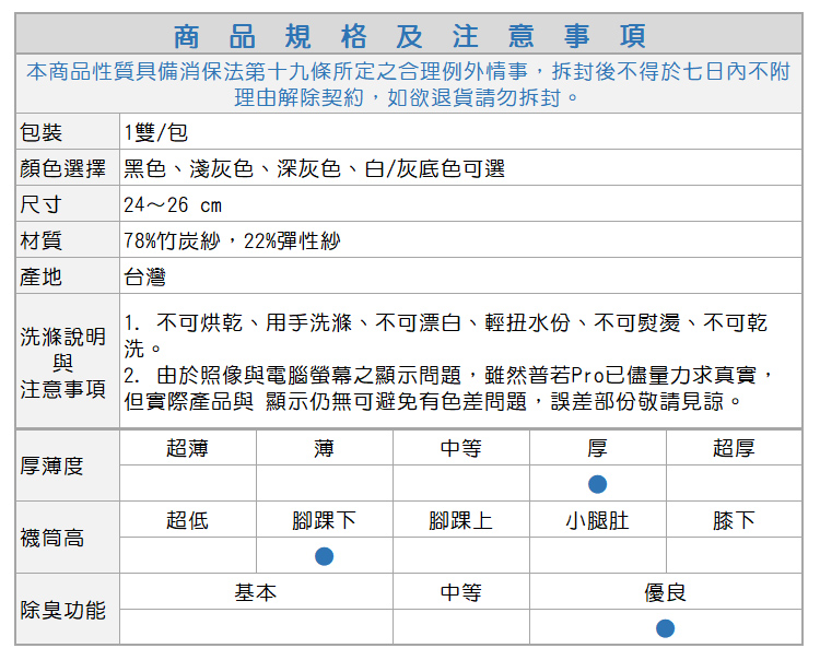 ● 採用台灣百和竹炭纖維,加以數十年的織襪經驗精製而成,品質優良,穿著舒適。