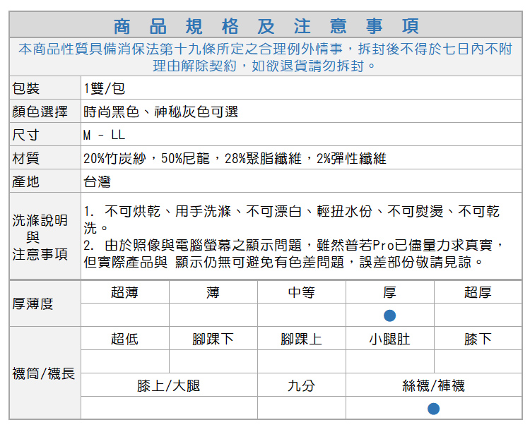 ● 成份:20%竹炭紗,50%尼龍,28%聚脂纖維,2%彈性纖維。