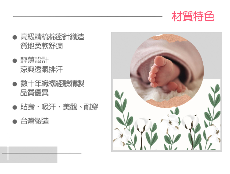 ● 採用高級精梳棉及密針設計,質地柔軟,貼身,吸汗,使寶貝穿著柔軟舒適。