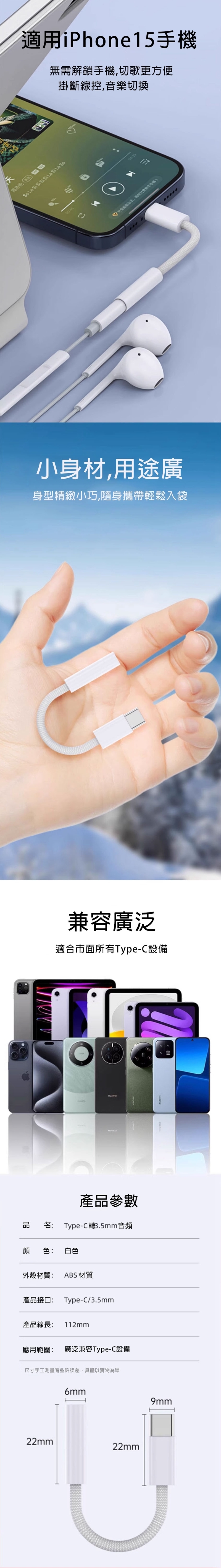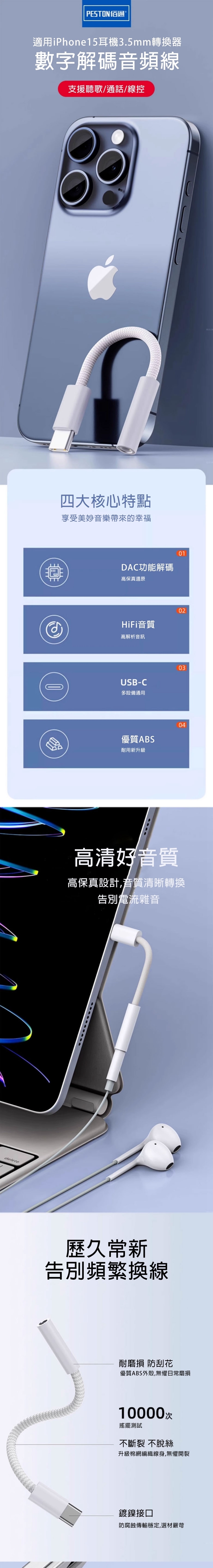 專為Type-C耳機介面設計,相容於98%以上的耳機使用,長度約96cm 損耗小,無損傳輸,適用於iPhone系列等手機使用。 |