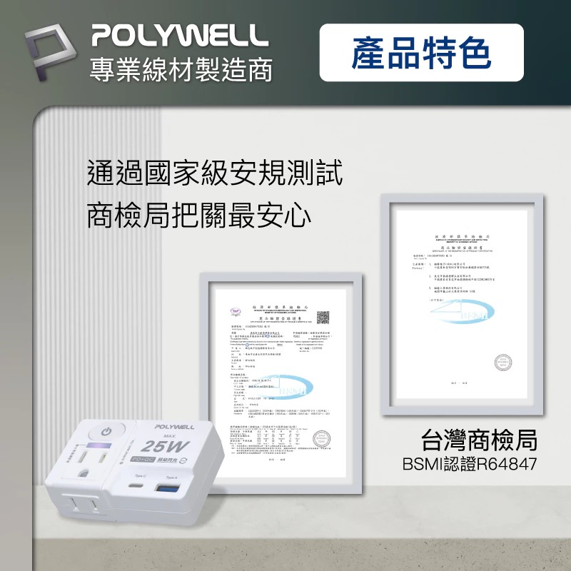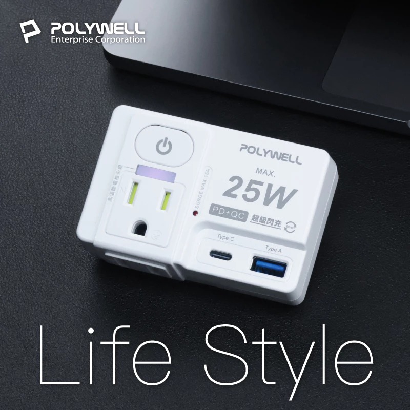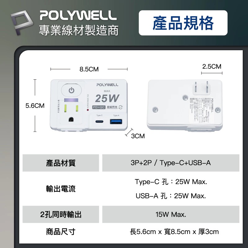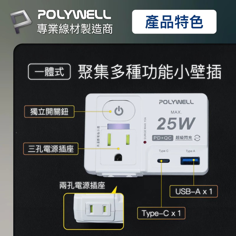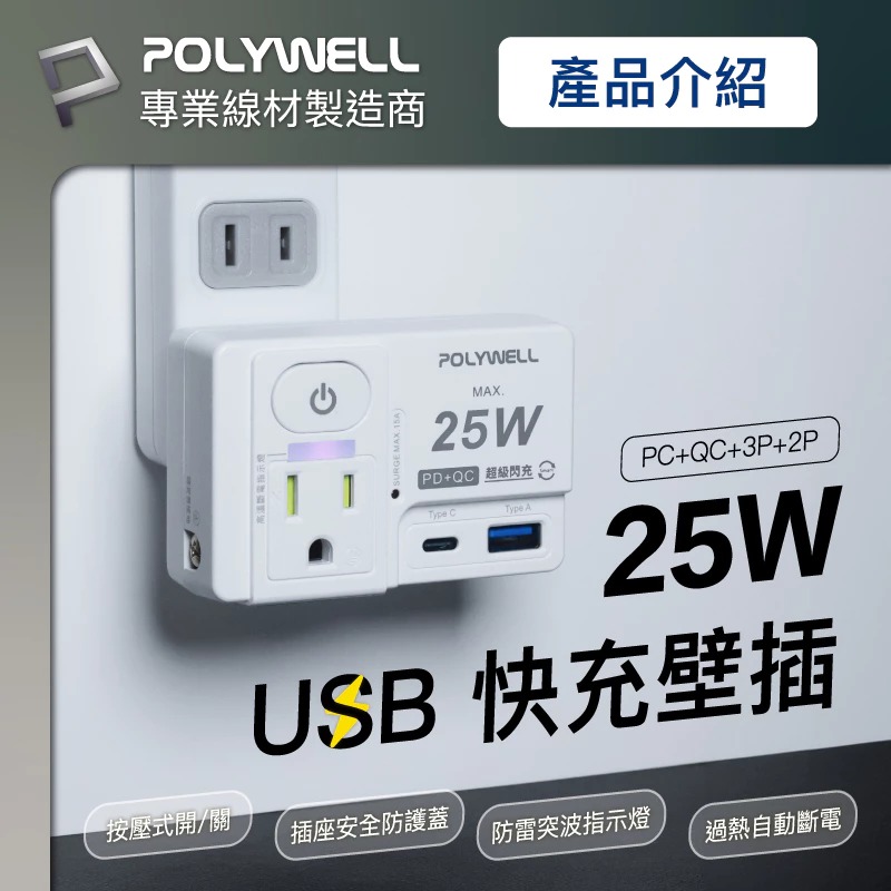 ◎ 產品: Polywell USB快充電源壁插 25W快充 1切2座