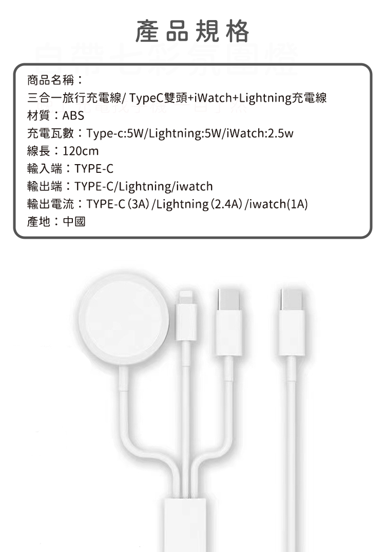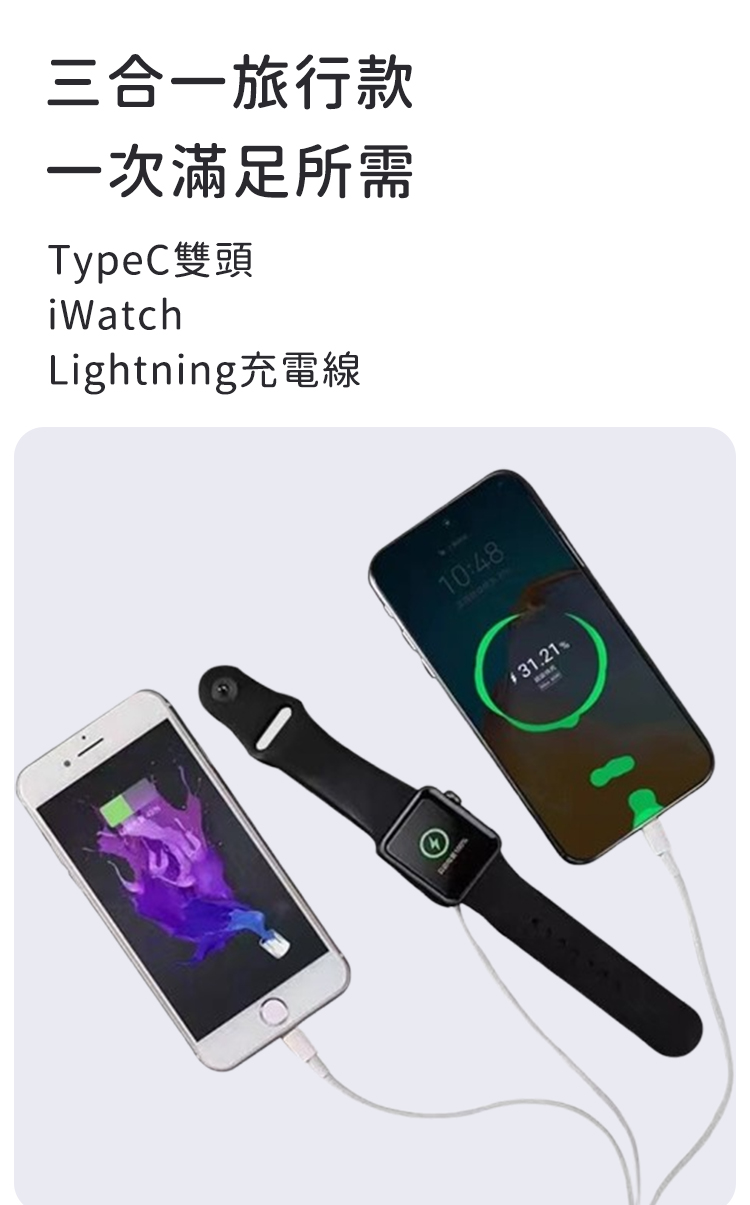品名:三合一旅行充電線/ TypeC雙頭+iWatch+Lightning充電線