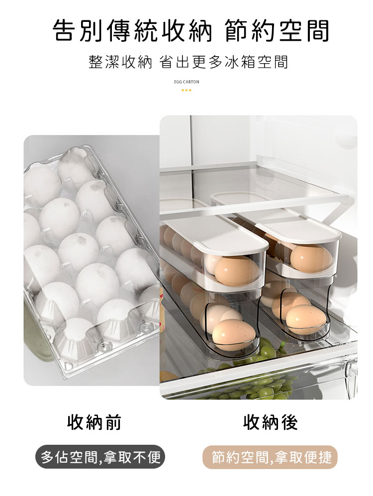 雞蛋收納新選擇!【雙層雞蛋收納盒】自動補位不卡蛋,透明防塵超好用,讓冰箱整潔一眼看完!