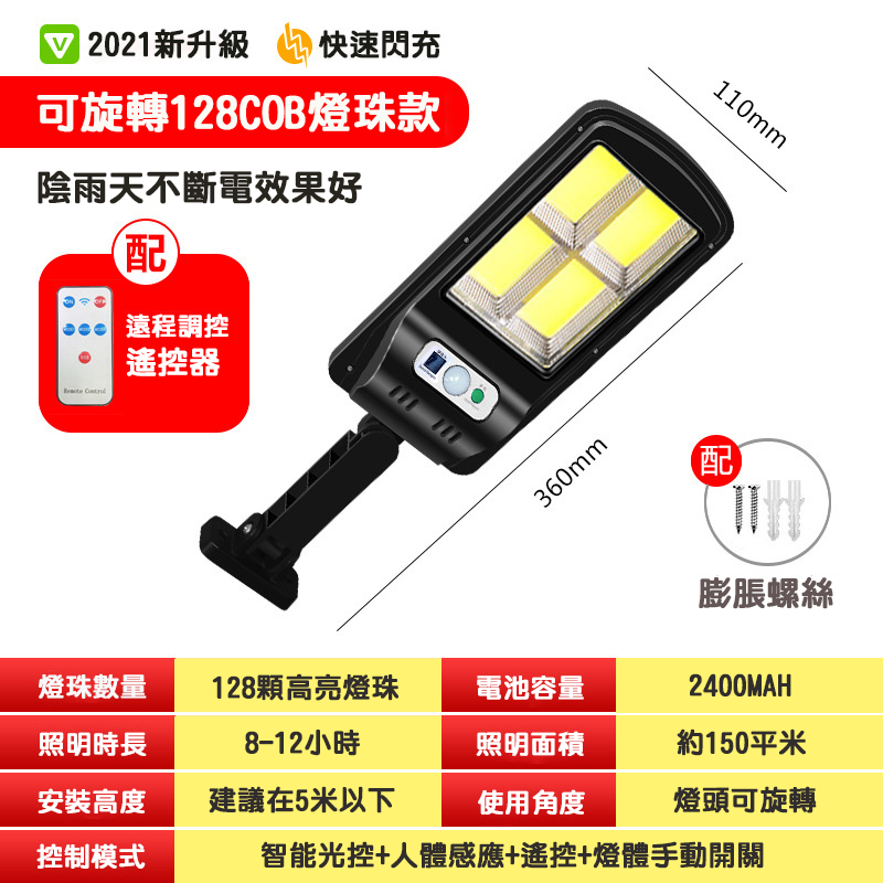 ☀【LED超亮太陽能燈】這些128COB LED超大燈珠的太陽能戶外燈提供了出色的照明效果。與市場上大多數類似的太陽能燈相比,運動角度為120度,可提供更亮,更長,更寬的角度照明。