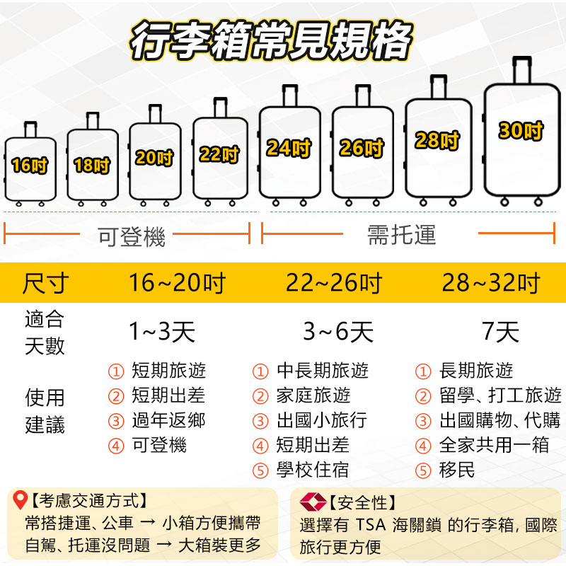 20 吋 約 50~55 cm 約 35L 登機箱,2~4 天短途旅行
