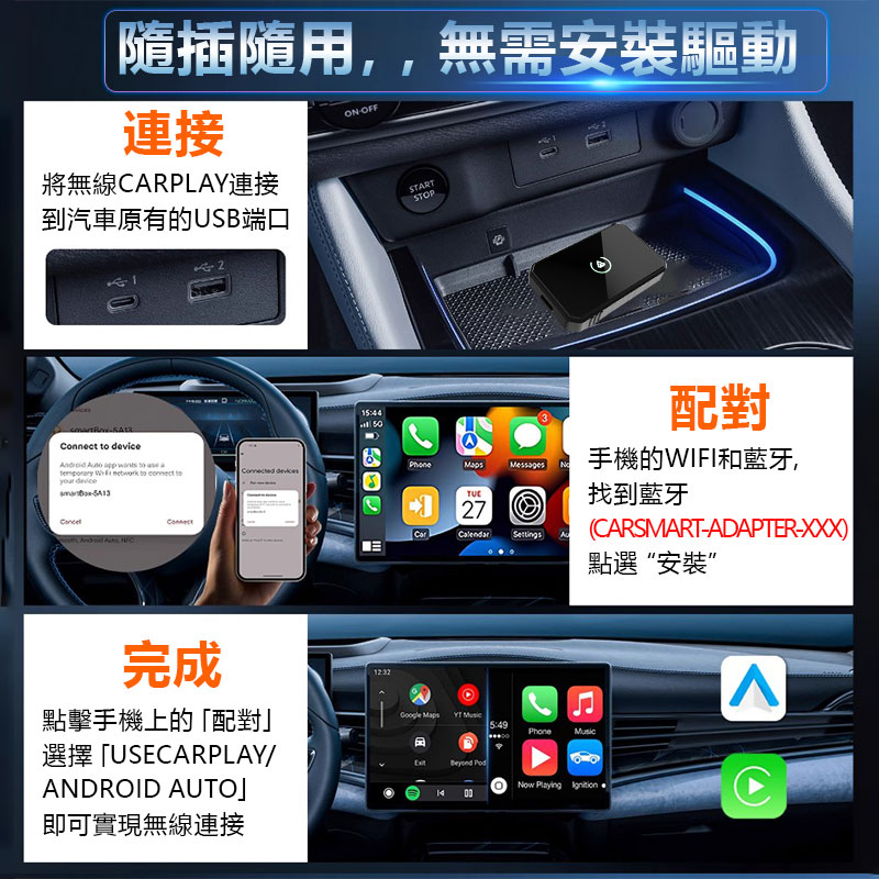 Carplay/Android auto 有線轉無線/內附Type C轉接頭,讓您隨時隨地自由連接!