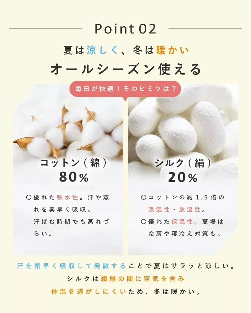 【冬暖夏涼】快速吸汗排汗,夏天感到乾爽和涼爽。蠶絲將空氣保存在纖維之間,使體熱難以排出,在冬天保暖。