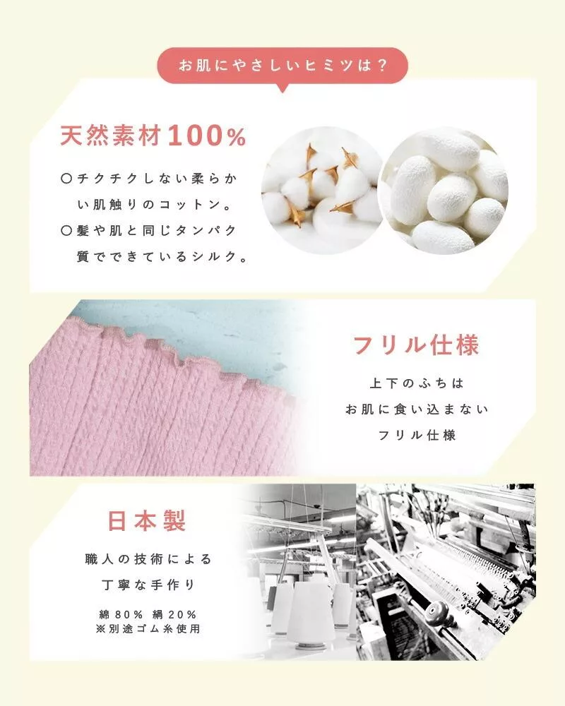 【天然素材】使用天然材質棉80% 、蠶絲20%,觸感柔軟 ,不會刺激皮膚。