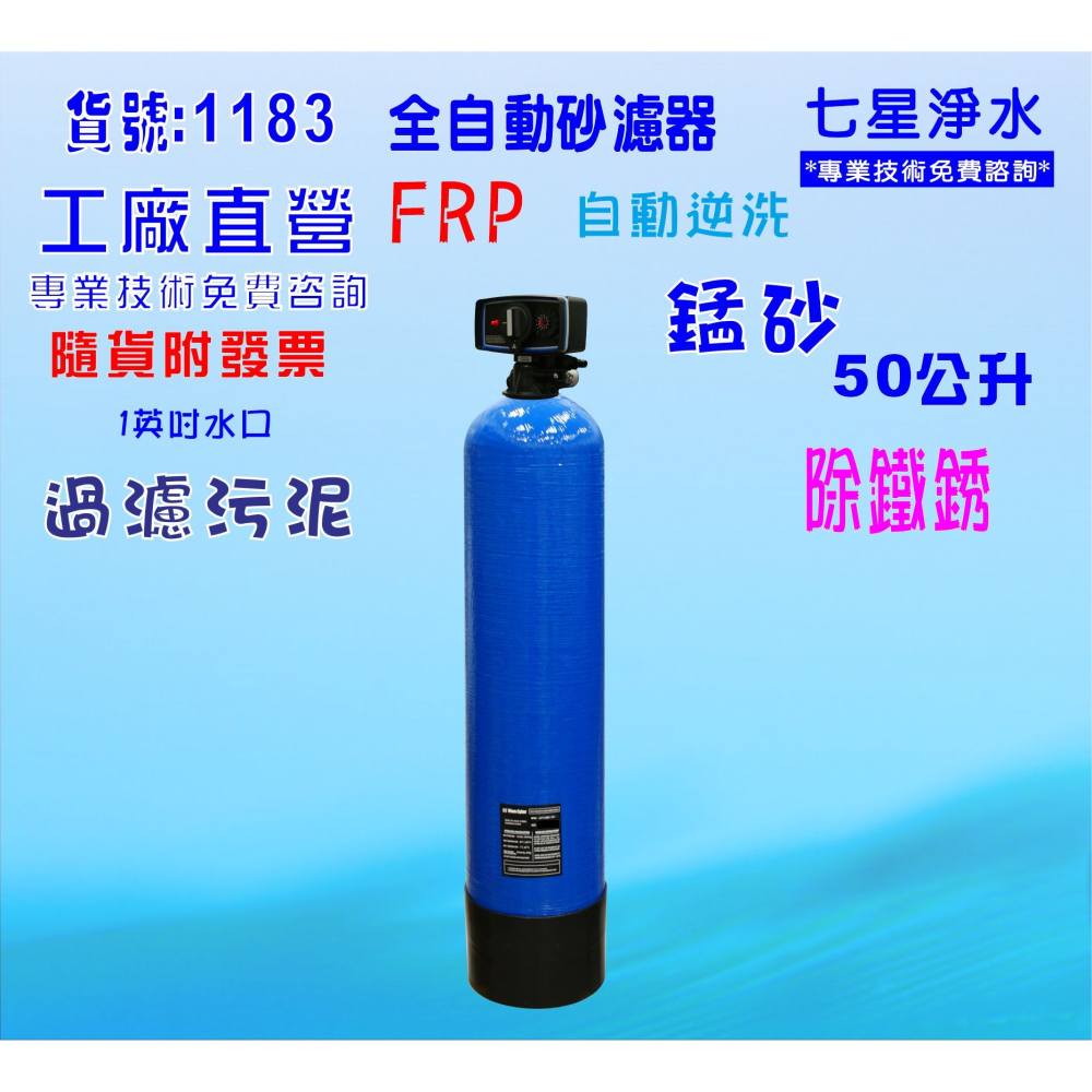 貨品編號:B1183 多筆商品選購只要付一次運費即可!(隨或附發票) 工廠直營/專業免費安裝技術咨詢! 品名:50公升全自動控制除鐵錳砂過濾器 交貨原料數量:=50公升 . 除鐵錳砂 功用:過濾去除、水中雜質、泥垢髒、去除水中鐵銹. 適用範圍:可用於大型RO淨水設備系統前置過濾、家庭水塔過濾、工廠機械冷卻、地下水水源、大型養殖水源過濾. 進出水口:1英吋NPT內牙 進水壓力必須1/2馬達壓力,逆洗操作才可完全! 可選擇:110V或220V