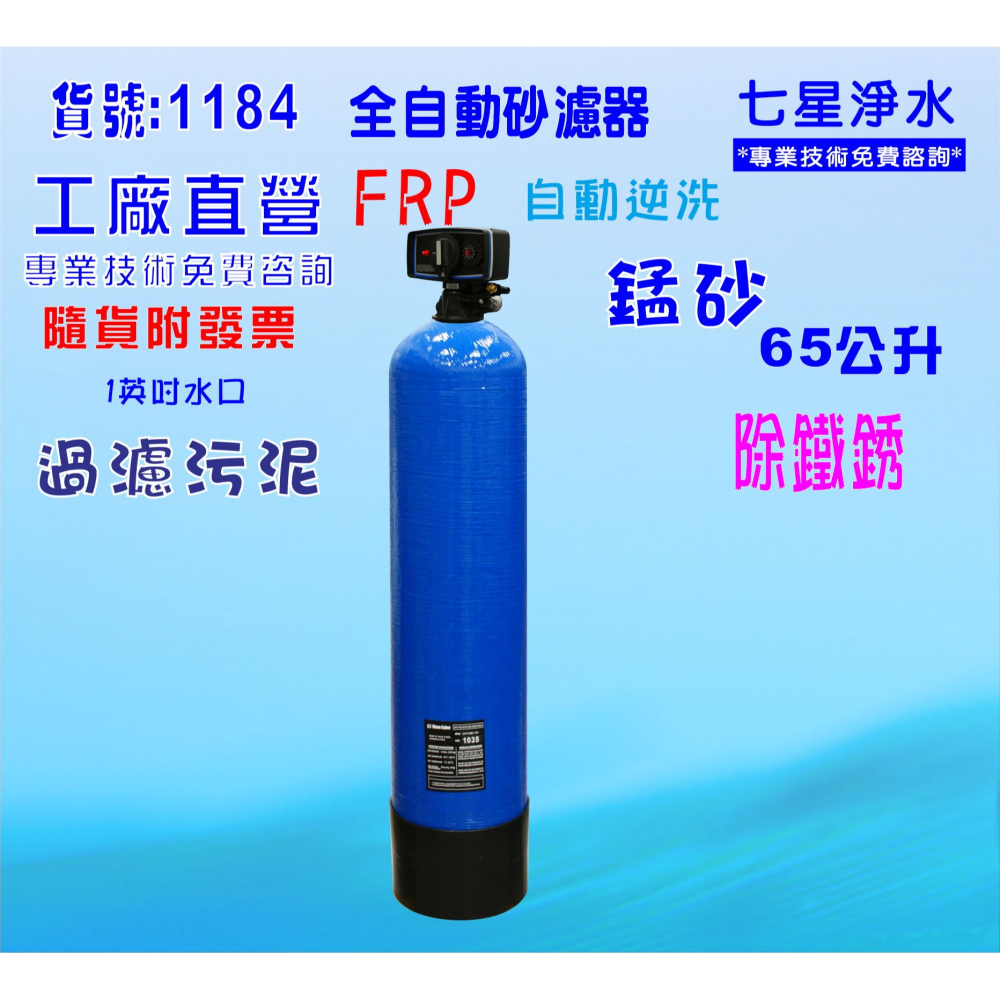 貨品編號:B1184 多筆商品選購只要付一次運費即可!(隨貨附發票) 工廠直營/專業免費安裝技術咨詢! 品名:65公升全自動控制除鐵錳砂過濾器 交貨原料數量:65公升 . 除鐵錳砂 功用:過濾去除、水中雜質、泥垢髒.、去除水中鐵銹. 適用範圍:可用於大型RO淨水設備系統前置過濾、家庭水塔過濾、工廠機械冷卻、地下水水源、大型養殖水源過濾. 進出水口:1英吋NPT內牙 進水壓力必須1/2馬達壓力,逆洗操作才可完全! 可選擇:110V或220V