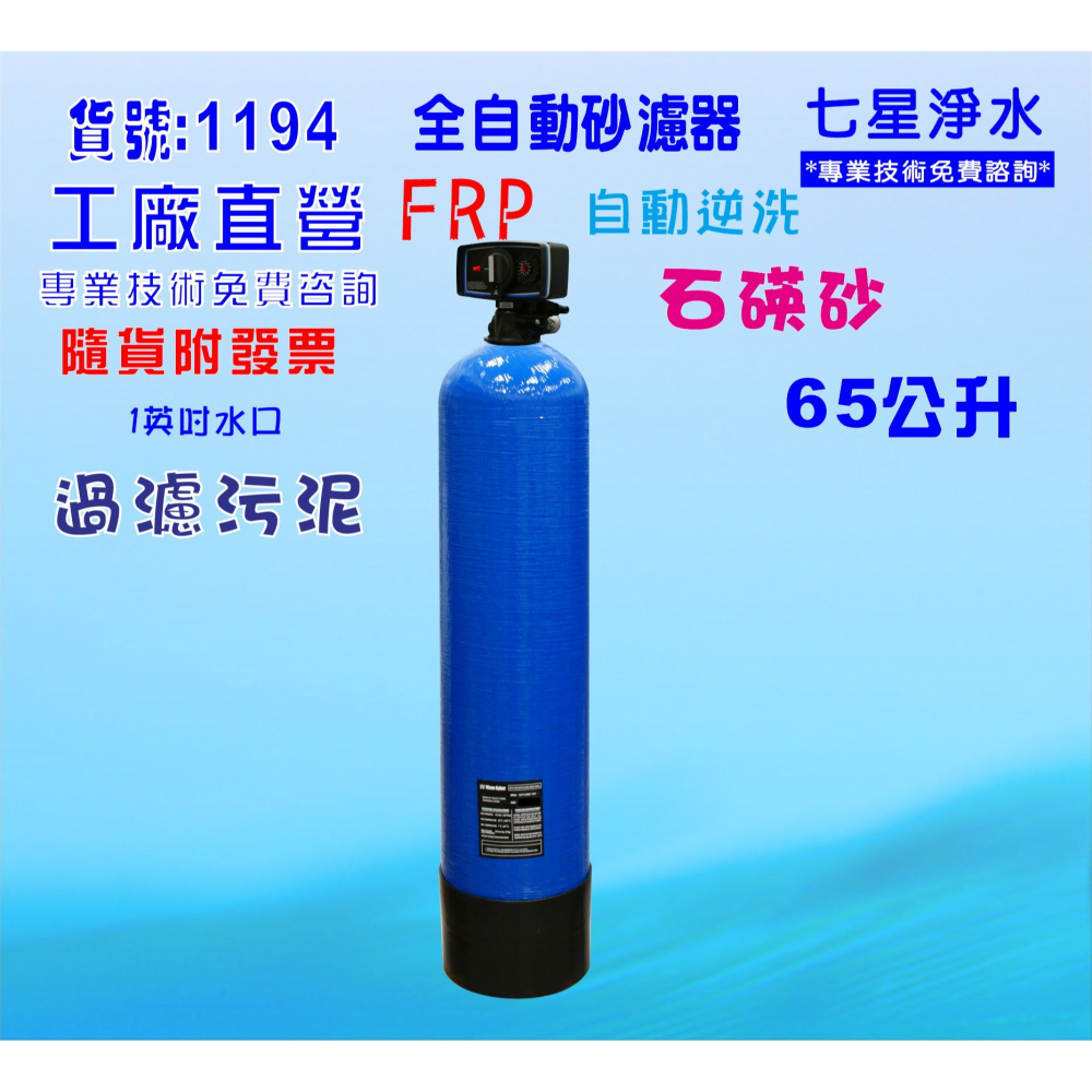 貨品編號:B1194 多筆商品選購只要付一次運費即可!(隨貨附發票) 工廠直營/專業免費安裝技術咨詢! 品名:65公升全自動控制石碤砂過濾器 主要材質:天然矽砂 交貨原料數量:65公升 . 石碤砂 功用:過濾去除、水中雜質、泥垢髒.、去除水中部份粗鐵質 適用範圍:可用於大型RO淨水設備系統前置過濾、家庭水塔過濾、工廠機械冷卻、地下水水源、大型養殖水源過濾. 進出水口:1英吋NPT內牙 進水壓力必須1/2馬達壓力,逆洗操作才可完全! 可選擇:110V或220V