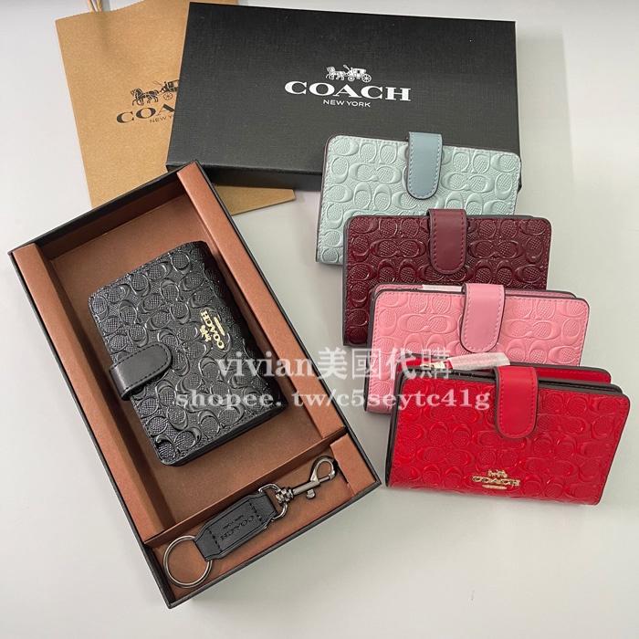 vivian美國代購✨正品 coach 女生真皮浮雕中夾 短夾錢包 按扣對折中夾 F25937 禮盒套裝配鑰匙扣