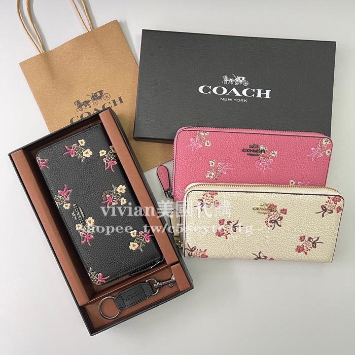 vivian美國代購✨正品 coach 女用長夾 真皮刺繡拉鏈錢包 F28444 禮盒套裝配鑰匙扣 女生皮夾 女生錢包