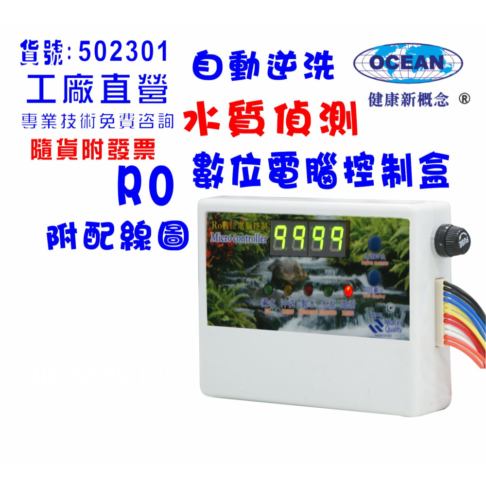 貨品編號:502301 多筆商品選購只要付一次運費既可! 台灣製造 超值價:每組1200元(隨貨附發票) 註解: 功能:TDS/24H/DC水質偵測、5燈號顯示裝置、全自動沖洗控制、停水自動切電(保護馬達停止運轉省電)、顯示製水時間、滿水自動停止切電、有觸控按3秒強制沖洗(排放濾殼內空氣) 、製水時需看PPm(總溶固體溶解量/60以下標準質) 觸控按3秒顯示PPm5秒後自動恢復製水時間.滿水停機自沖洗15秒後螢幕顯示P00數字. ---------------------------------備附配線圖示(配線簡單對照線的顏色)