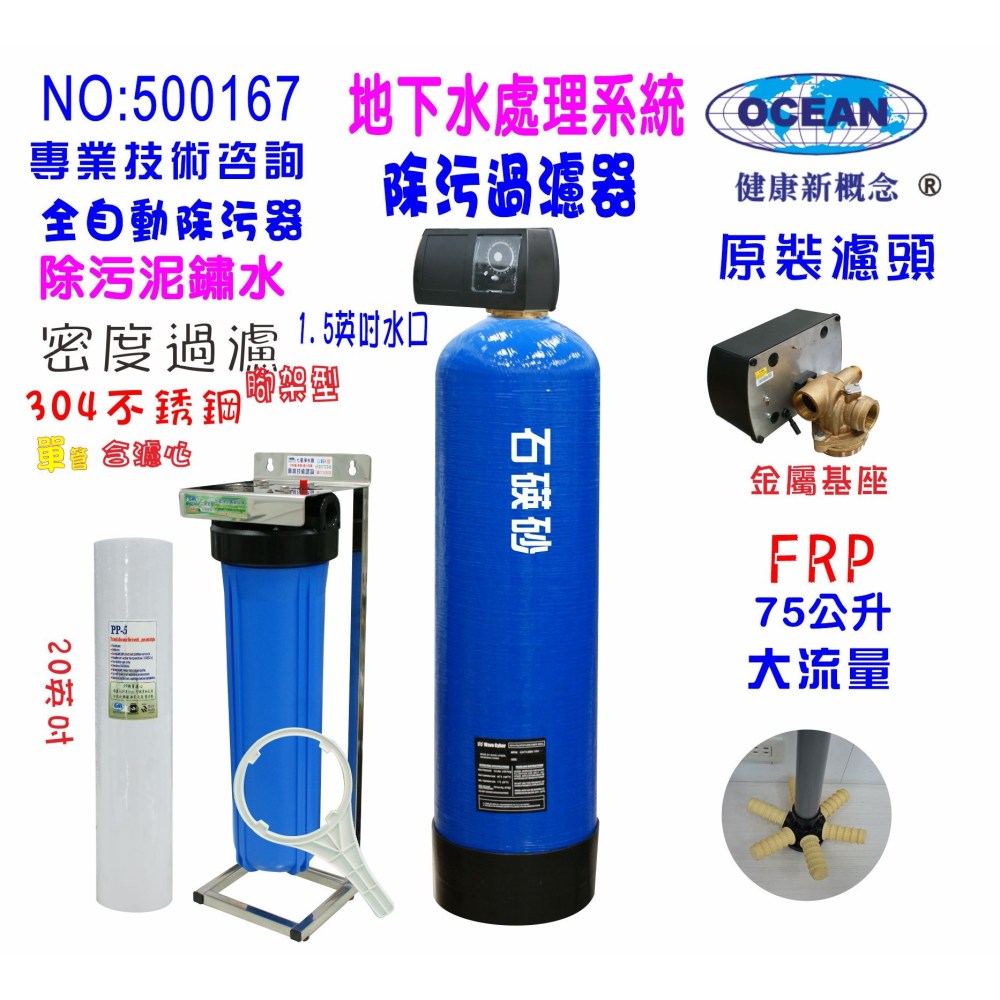 進出水口:1.5英吋NPT內牙 進水壓力必須1/2馬達壓力,逆洗操作才可完全! 交貨原料數量: 75公升 . 除污石碤砂