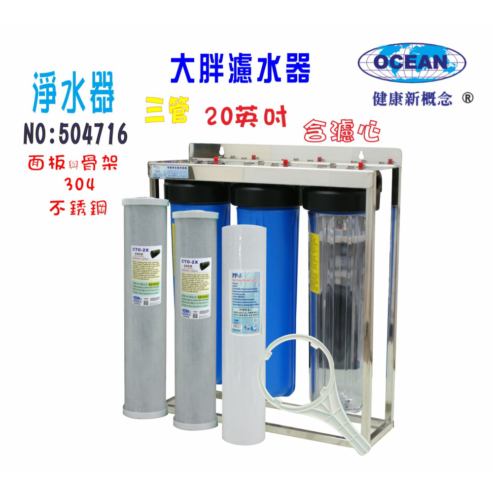 貨品名稱:20"大胖三管透明藍色過濾器白鐵螺絲固定