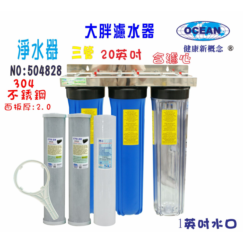 貨品名稱:20"大胖三管透明藍色304白鐵不鏽鋼面板過濾器(含濾心)