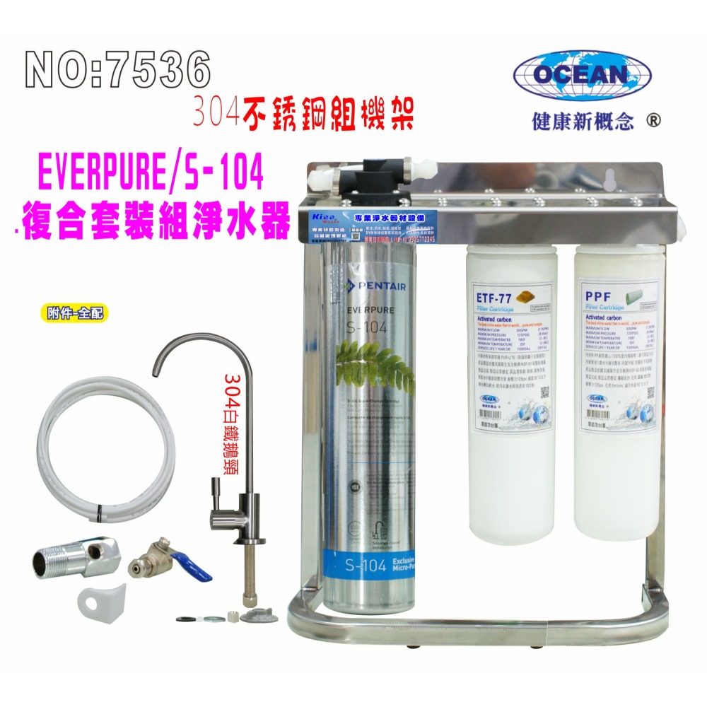 適用濾頭:可與3MEverpure.卡式濾頭共用 H-104.S-104.S-100.S-54 MC.MH.CFS9112.CFS9812X CFS9812XS.CFS9812ELX OCEAN- CH350同款式可更換用. 總過濾量:33138公升流速每分鐘8.5公升.比較功能等級3MEverpure相等優越! 最高耐壓:120PSI 第一道 卡式棉質PP濾心------ (過濾孔徑5微米)10” 第二道 卡式英國PUROLITE離子交換樹脂濾心 第三道Everpure 家用S104淨水器 配件:304不銹鋼鵝頸龍頭、2分考克、4分進水三通、2分PE管6米.6 吊片.